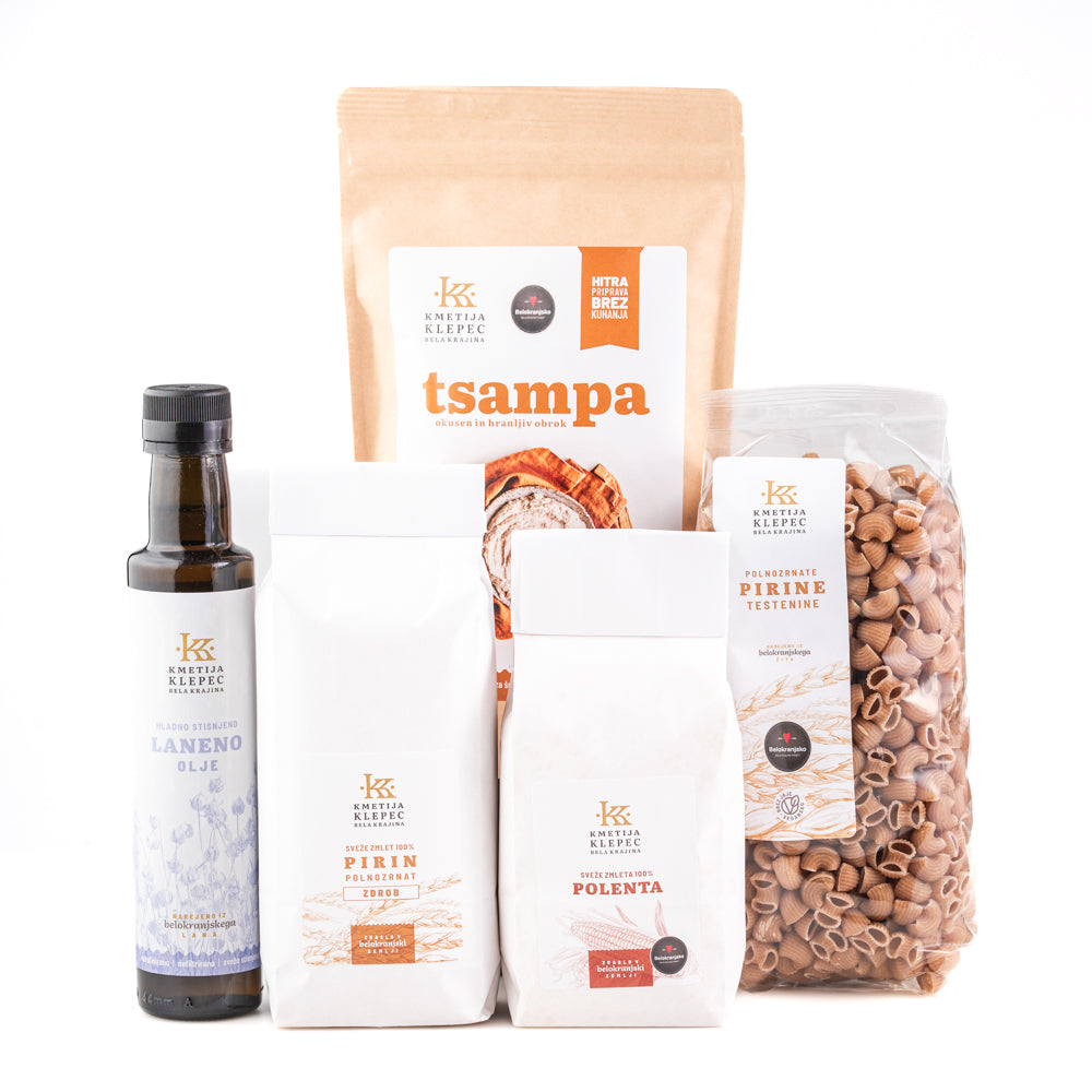 Naša popularna tsampa je narejena zgolj iz ječmena in je toplotno že obdelana, ne potrebuje kuhanja. Ječmen je iz naših njiv. O polenti najbrž ni treba izgubljati besed, naša je narejena iz domače sorte trdinka, okusna, dobra, tudi odrasli jo obžujemo. Pirini makaroni so narejeni iz pire, ki je zrasla na naših poljih in so brez jajc. Testenine so kuhane manj kakor v petih minutah.